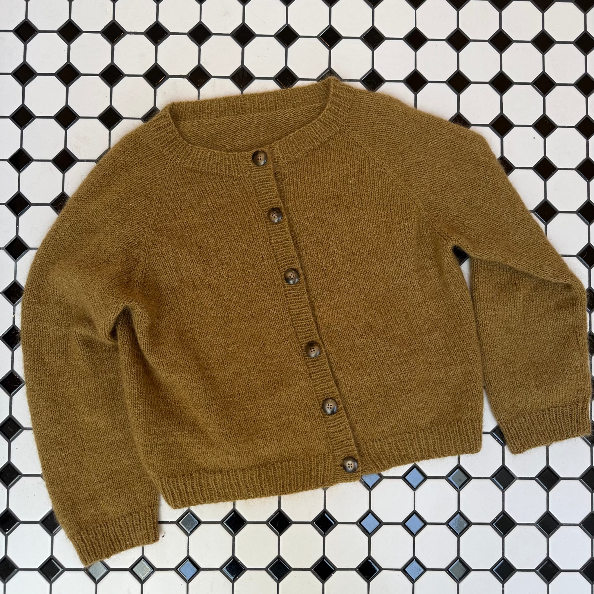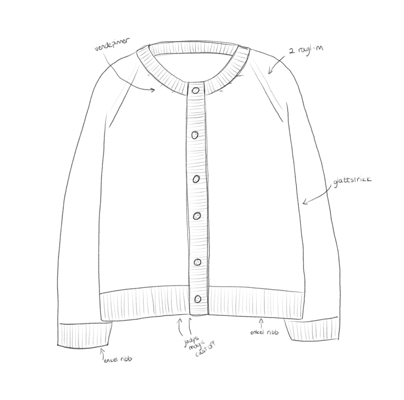 Dagligcardigan er en tidløs og klassisk cardigan med raglanøkninger. Den strikkes ovenfra og ned. Det strikkes vendepinner for å forme halskanten og for å få cardiganen lengre bak enn foran. Ellers har den en ganske rett fasong. Det felles noen omganger nedover ermene før vrangborden. Videre strikkes det opp masker langs begge forstykkene og det strikkes to knappestolper. Siden cardiganen er så rett i fasongen, kan man velge selv hvilken bevegelsesvidde man ønsker. Alt fra 5-35 cm bevegelsesvidde. Mål egen overvidde, legg til ønsket bevegelsesvidde og finn den størrelsen som er nærmest. Siden den strikkes ovenfra og ned kan lengden på bol og ermer enkelt tilpasses deretter. Målene i oppskriften gir en kort modell.
